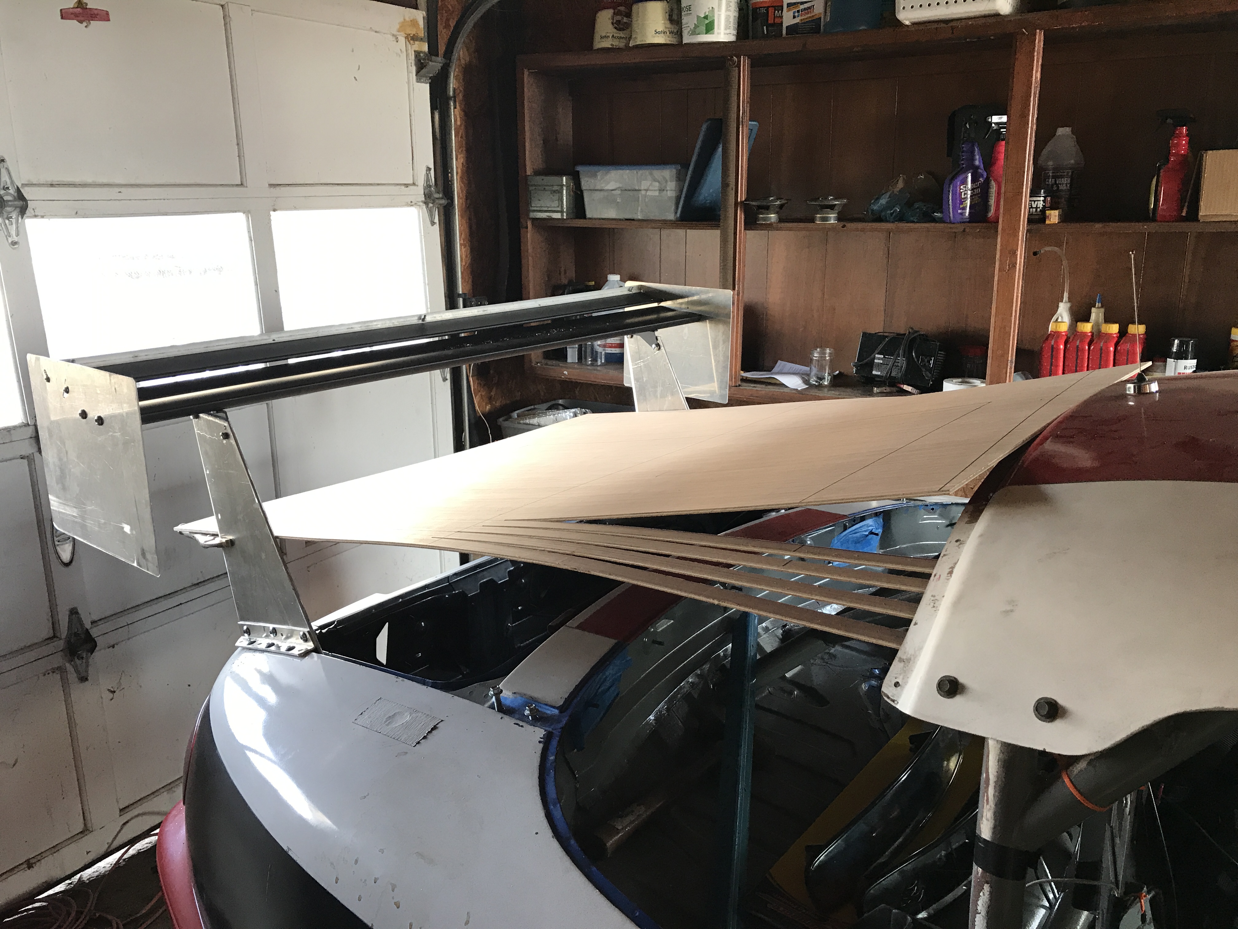 I added a strip of angle aluminum along the body, which acts as the base of the fastback. These rails meant I could no longer use the stock trunk, which became a slight problem when I did the testing at Watkins Glen. Not a functional problem, but I wanted to test OEM bodywork, and that was no longer possible with this modification.