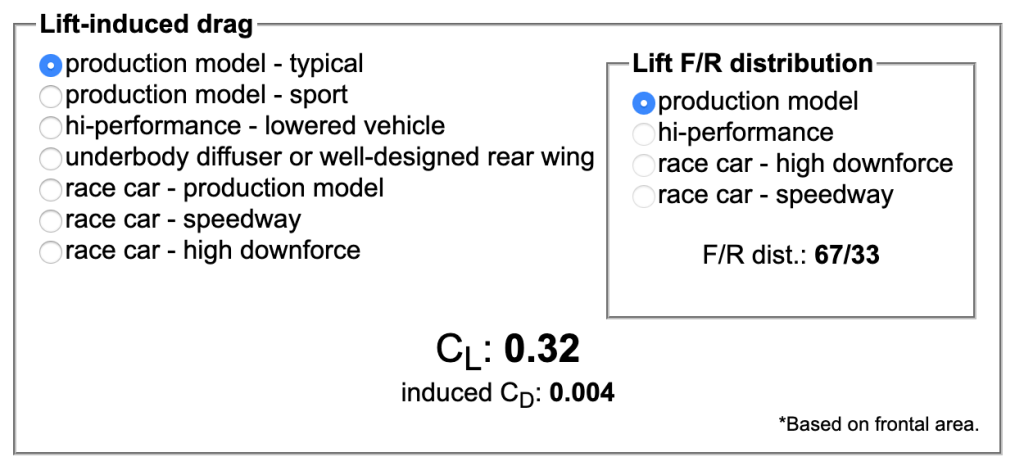 The HP Wizard calculator can also calculate lift. If I choose the standard production model options, then my Miata model has a coefficient of lift (Cl) of .32. That’s pretty accurate based on other data I’ve seen. Let’s use the calculator’s lift options and see what happens to drag and lift as I lower the car and add downforce.