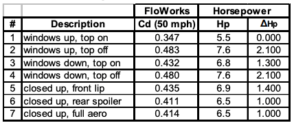 From the scale model and flow visualizations, they concluded that the CFD model was accurate enough. And from this, they could test a few different configurations, and see how drag affects HP at 50 mph.