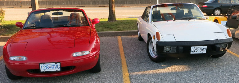 They have similar frontal areas, but the 914 has a better coefficient of drag (.363 vs .38). I suspect this is partly the front end, which covers the tires completely from airflow. The 914 canopy might be better as well, since a vertical rear window is better than one that slopes back at 25-35 degrees, which is the worst possible angle, and about what a Miata hard top has. But in many ways, these cars are not so different, so let’s take a look at the 914 in more detail.