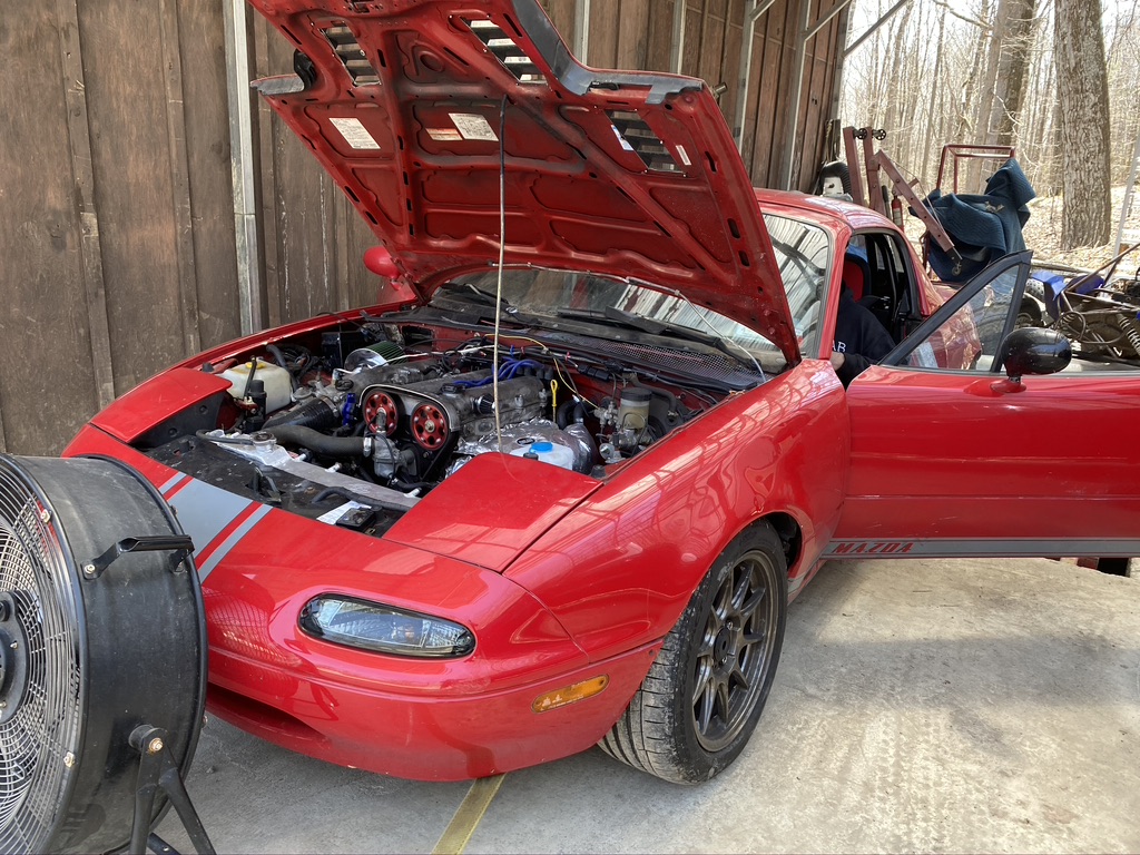 Some background on the Napp cars. Dylan’s car started as a NA6, and, not satisfied, he did a NA8 swap with an exhintake cam. It dynoed 102 hp on Rick’s dyno, and in Dynojet terms that’s more like 114 hp. That’s not a very strong NA8, but it was choked by a 1.6 wiring harness including the AFM flapper valve. In the end, Dylan decided a VVT swap would be better.