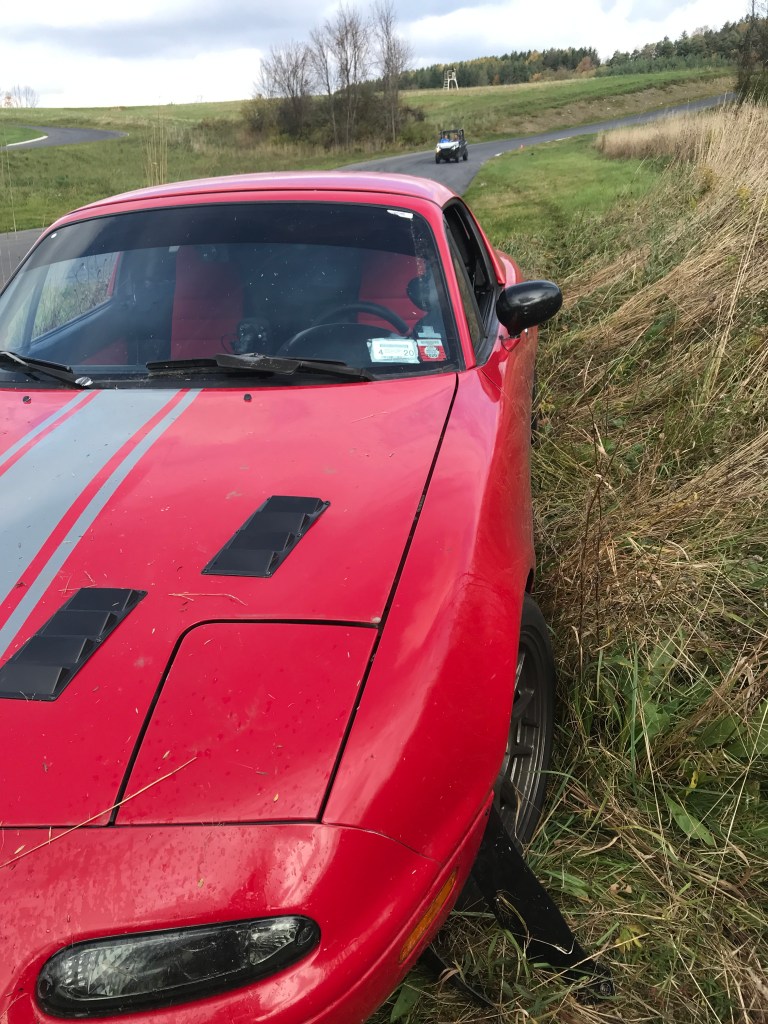 It went pretty well until I stuffed it into the weeds. The splitter dug in hard, bending the mounting brackets, the undertray got shoved underneath the car, and I sheared some bolts and plastic. It wasn’t pretty.