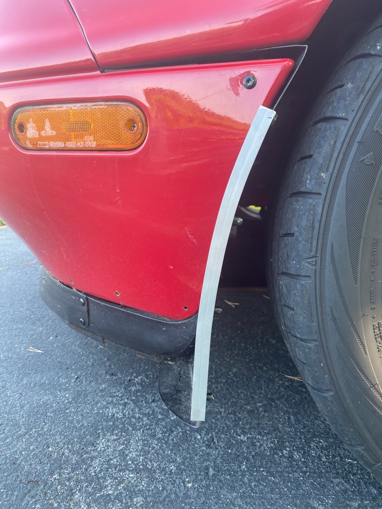 One of the things I don’t like about the NA front end is that it doesn’t have enough tire coverage, and so I built some front spats to deflect air away from the tires.