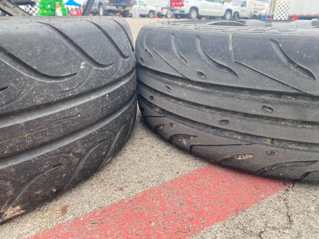 If you’re thinking the minivan racecar doesn’t have enough camber, it has -3.5 degrees. Tom says that tire deflection has a lot to do with wear, and that it was the 7″ wheels that were to blame. So we rotated tires around as best we could, and used some older tires that were well heat cycled (or cycled out) on the front, and did our best to finish the race.