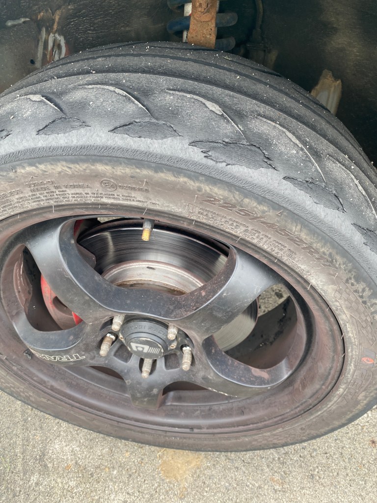 In foresight, I’d brought two wheels from my wife’s Honda Civic, with the intention of A/B testing them for one session, and then secretly putting them back on her car before she knew. Her wheels were shod with Nexen NFera Sur4G 200TW tires, which we’ve raced on the van before (in a 16″ size, not these 17″ ones) and they’ve worked well.