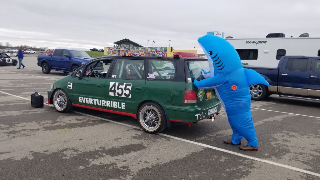 Every year I race Tom Pyrek’s minivan in the 24 Hours of Lemons. We’ve done NJMP Thunderbolt, Thompson, and PittRace together. The van has been the source of some really good themes, and is better on track than it should be. It’s a first gen Honda Odyssey (also badged as an Isuzu Oasis), the one with 4 doors instead of a slider, and with an anemic 4-cylinder Accord engine. Tom’s minivan racecar has thankfully been manual swapped, but it still struggles with an open diff, terrible aero, and a lot of weight.