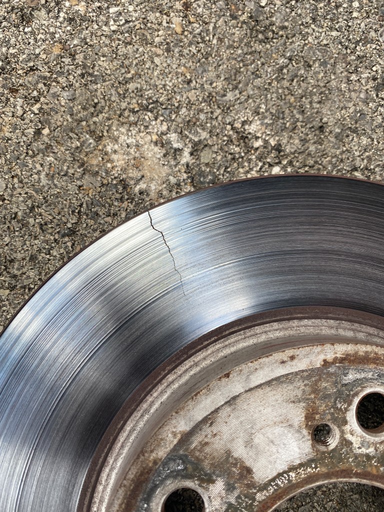 So with our tire woes somewhat sorted, the next thing was our brakes. I could hear something grinding and vibrating, so I brought the car in. We got the wheels off and noticed it had a cracked front rotor.