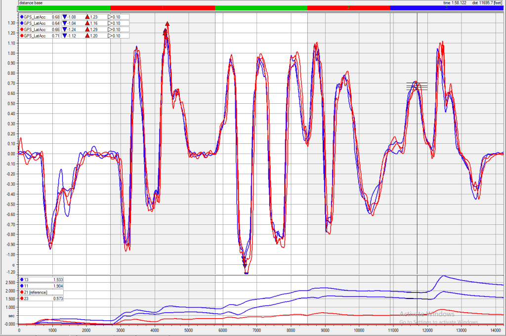 Next take a look at lateral Gs, and this is where you can see the Nexen’s have an advantage. And they should. Sur4Gs are known to be a 200 TW autocross tire, and the 651 is a budget 200 TW tire. You can see that the red lines are both higher and lower than the blue lines, indicating more grip (low means left turn, high means right turn).