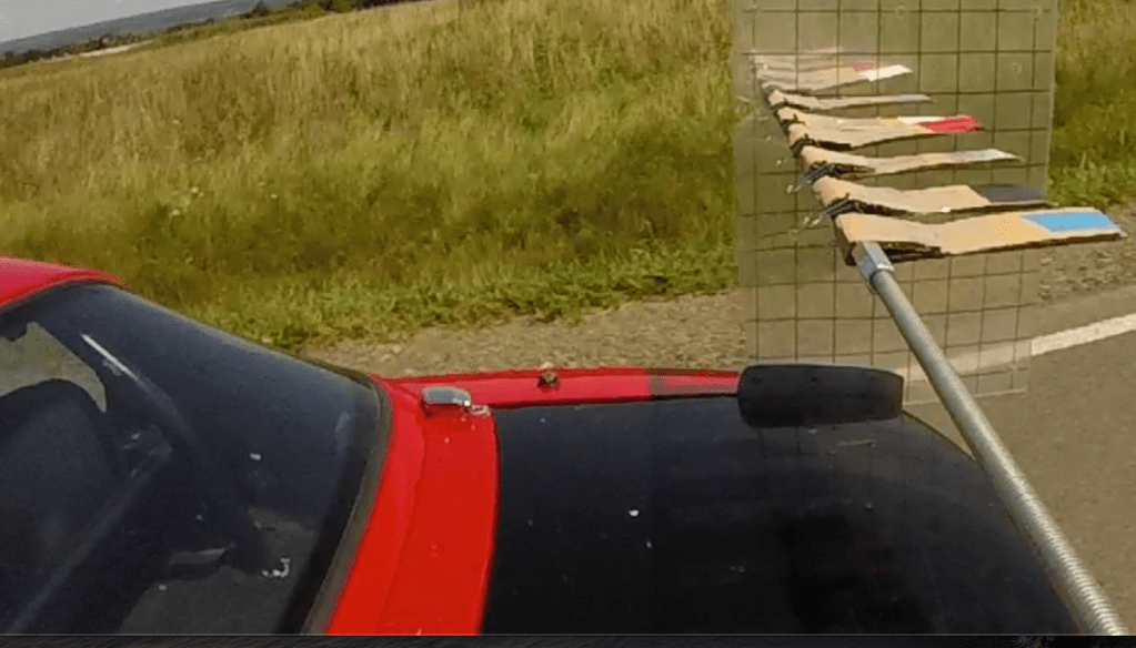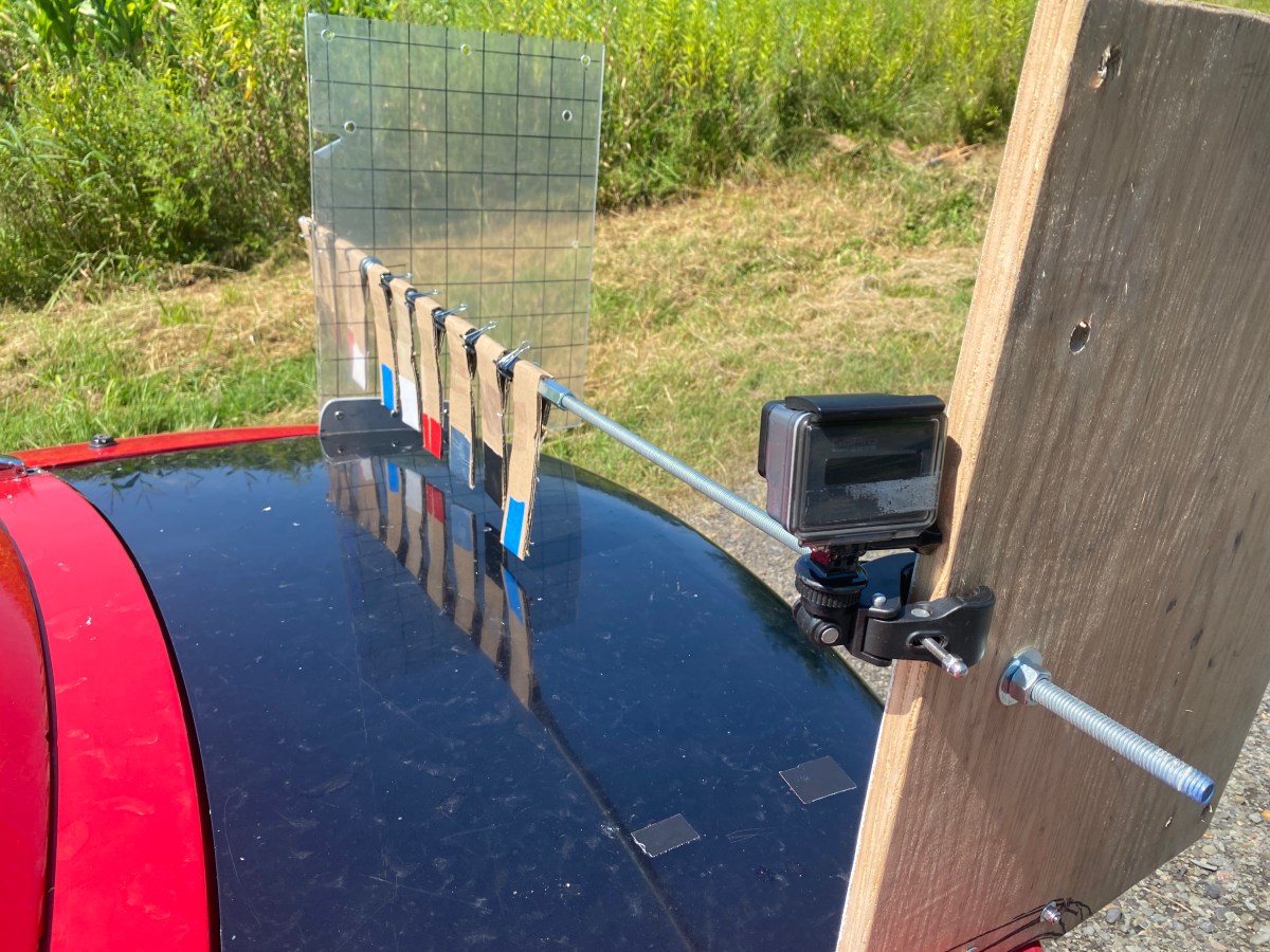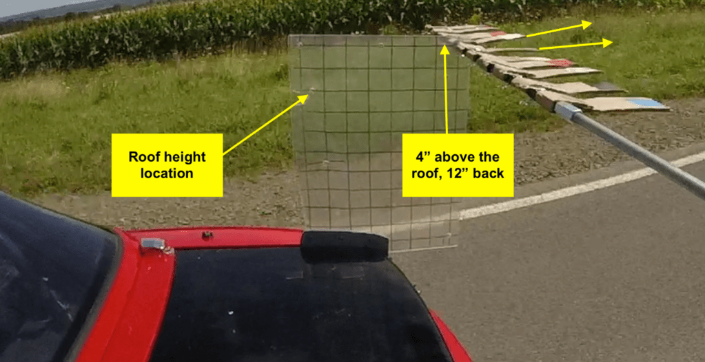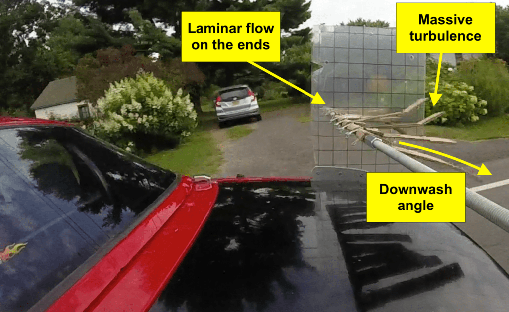 In the following video still, I’m doing about 20 mph and all the cardboard telltales are going straight back without any up or down movement. The telltales at the end of the wing are level with the road, and the ones in the middle of the wing are level with the black lines on the acrylic plate. So this means there’s about a 7 degree downwash angle on the sides of the roof, and what looks like 5 degrees in the center.