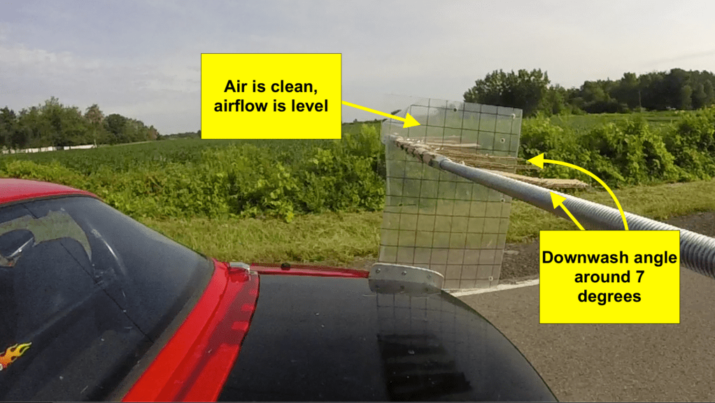 I then retested at roof height and forward, and here you can see the 7 degree downwash angle on the telltale that’s inside the wing stand (level with grid lines), and the one on the outside is level with the ground. The telltale that’s in the exact middle of the roof appears to have slightly less angle.