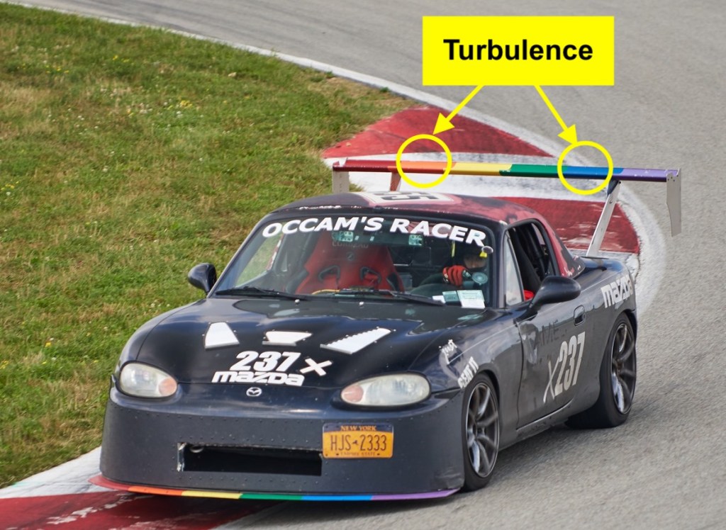 The cause? My guess is that air is wrapping around the sides of canopy, add it must detach in this region. This makes a lot of sense, because air doesn’t like to change direction at more than 12 degree or so, and needs help in the form of strakes, vanes, and other tricks to do so. This is true whether we’re talking about air going over a roof, under a diffuser, or around the sides of the canopy. The Miata’s hardtop wraps around too abruptly on the sides, and air can’t stay attached. The result is downstream turbulence hitting the wing.