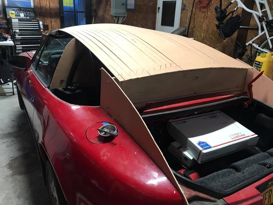 I started by using the front bow of the soft top frame, so that I can quickly attach it to any NA/NB Miata. I then took a piece of thin luaun plywood and cut slits in the back half of it, and then shoved this under the soft top frame.