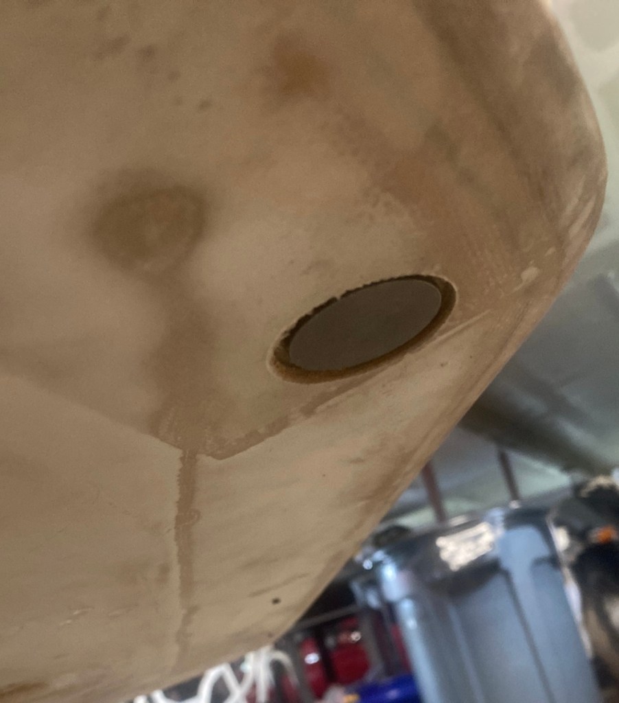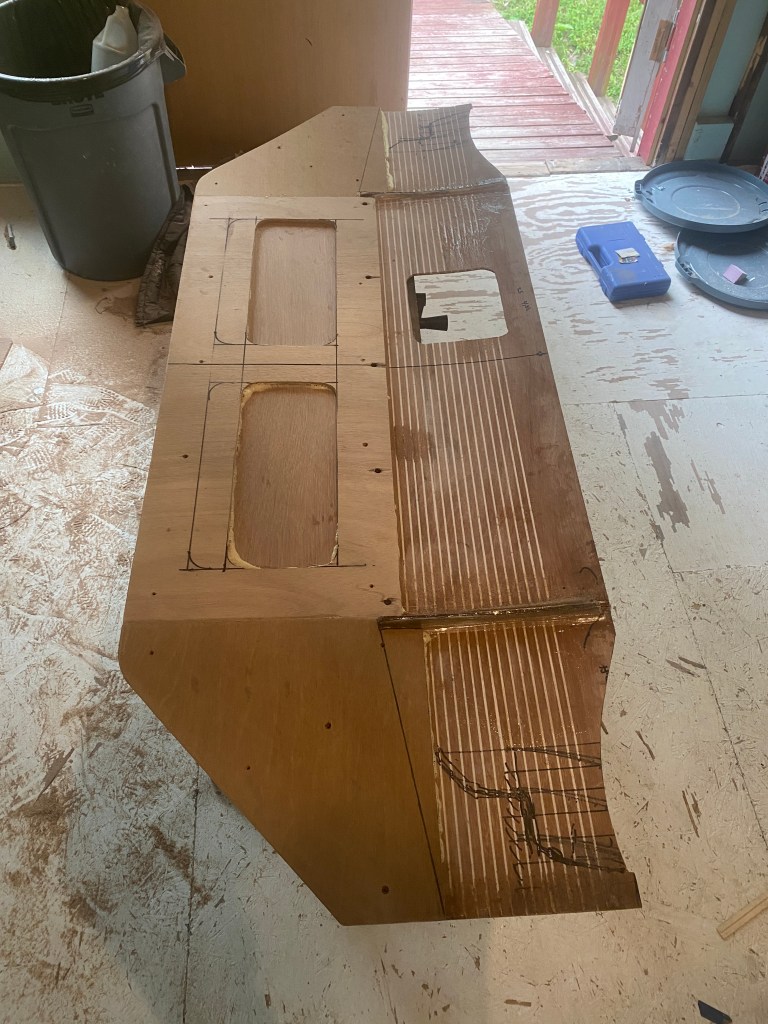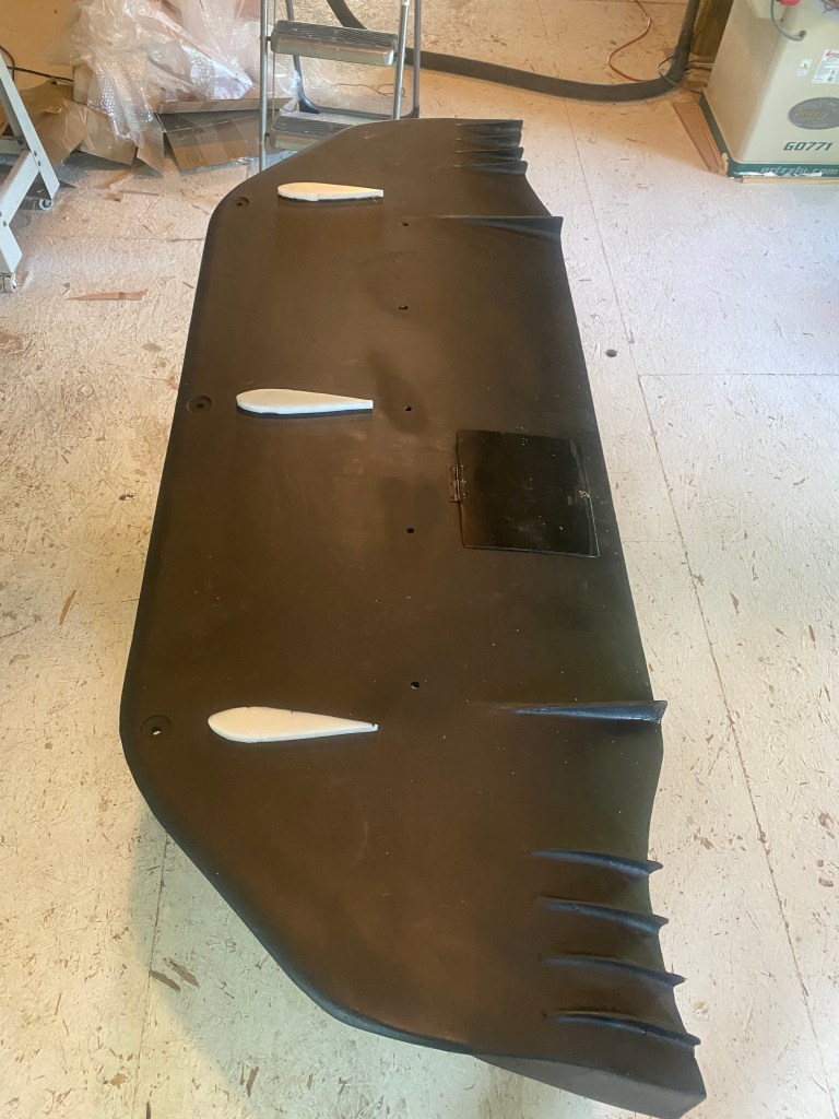 To make the strakes I cut an arc into the splitter and slid rectangular pieces of thin plywood in the slots. I then trimmed the top side (the side facing the engine), and then fiberglassed over the exposed bottom strakes.