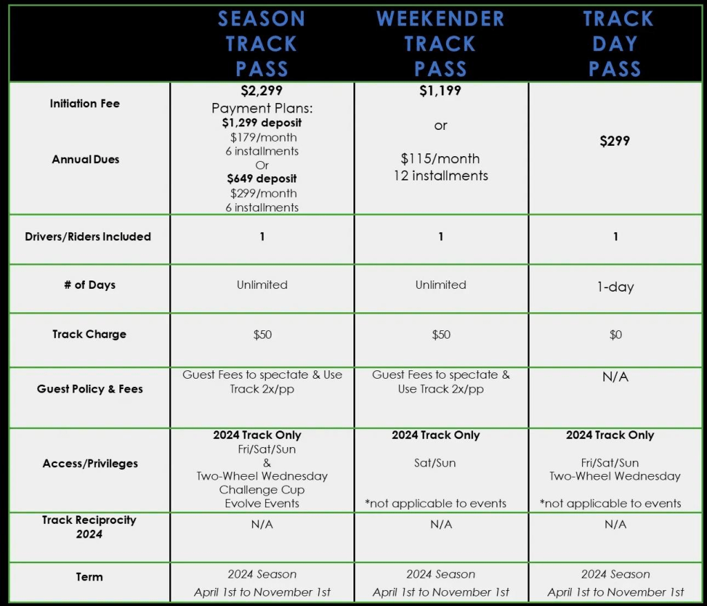 The best deal in motorsports is the Weekender. At $1200 plus a $50 use fee, you’ll beat the day pass pricing after five visits. If you come a dozen times, you’ve now cut the day use price in half, at just $150 per day. Or if you’re a masochist that can manage 24 track days, you’ll do that for just $100 per day.
