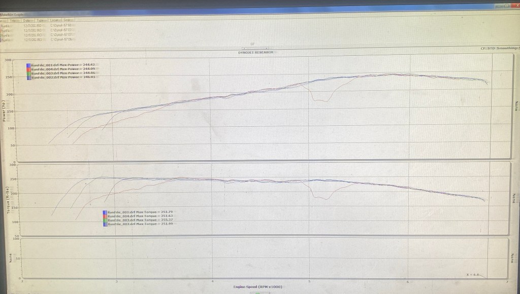 244 hp is about a 12% drivetrain loss, which is better than I expected. But note that the car was going into winter storage, so I filled the tank with ethanol-free 90 octane, and it may make more power on 93, and even more when the engine loosens up.