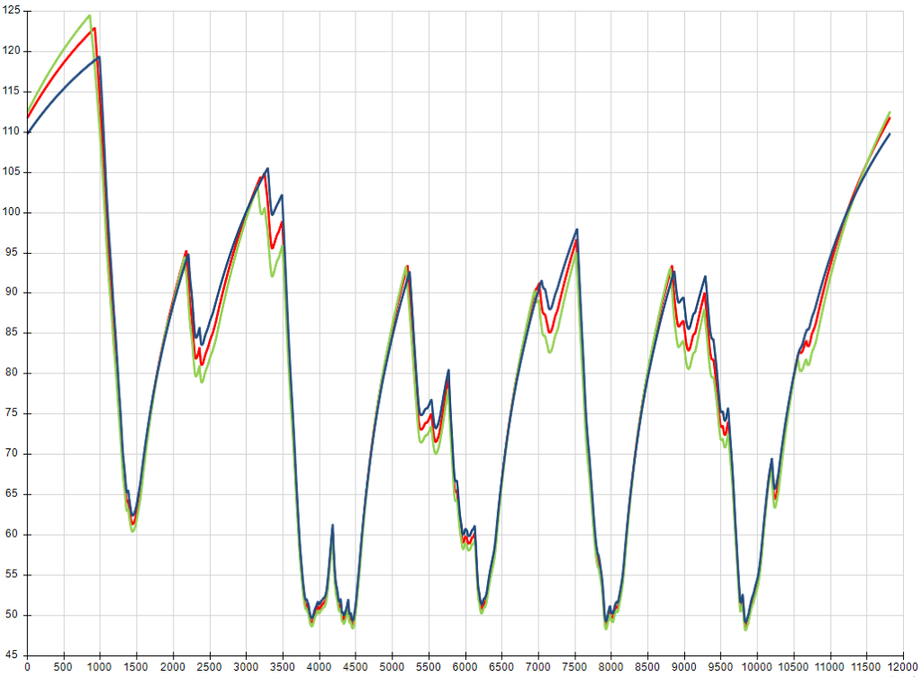 I’ve tested all of these parts in a wind tunnel, and so the drag and downforce numbers are accurate to within a couple percent, even though it looks like I’m just choosing round numbers. To compare lap times on each aero build, I’ll throw them all into Optimum Lap and see the time deltas for different tracks. In the following table, the numbers represent the time advantage per lap versus the OE aero.