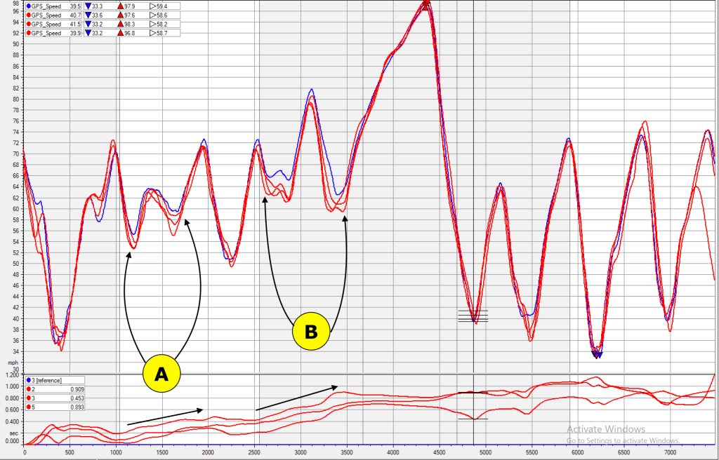 But I think what I’m seeing here is that I probably drive the car to the same level of instability. When the car is more settled, it allows me to release the brakes sooner and/or open the throttle earlier. And that flattens out mistakes I make from corner to corner.
