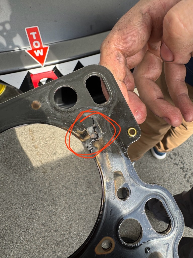 The problem was a rookie mistake, which is normal for a rookie team. The owner and builder was chasing more power, and installed new cams before the race. This required claying up the pistons for valve-to-piston clearance, and then removing the head to measure that. In the process, Phil reused the head gasket, and that was probably not a good idea.