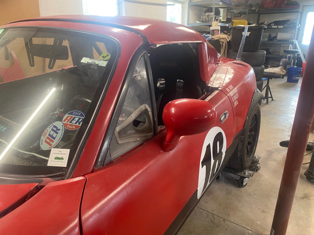 Treasure Coast Miata sells their “Chop Top” for budget endurance racing. It’s an economical and lightweight top that does the job of enclosing the roof. This has two benefits: better aero, and you don’t have to wear arm restraints when racing (the car is no longer considered a convertible). I fabricated mounts that attach to the hard top brackets, and with those the total weight of the Chop Top was a scant 7 pounds.
