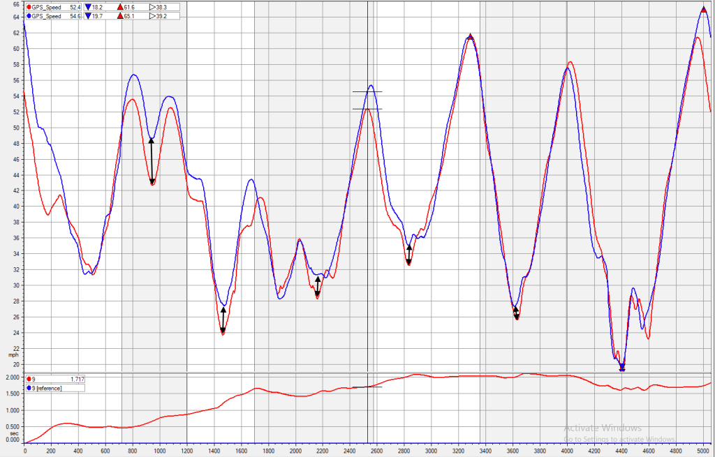 The N wing also had the least drag, and posted the fastest top speed of 132 mph on the back straight. But the OEM wing also had the least downforce, and you can see this on the speed trace below, where I compare the OEM wing (red) to the same wing with a Gurney flap (blue). Note the difference in speed through the esses, it’s huge. But also note the vMins in each corner that I’ve circled. Not only are the vMins higher, they are shifted to the left, indicating that I’m backing up the corner better when the car has more rear downforce.