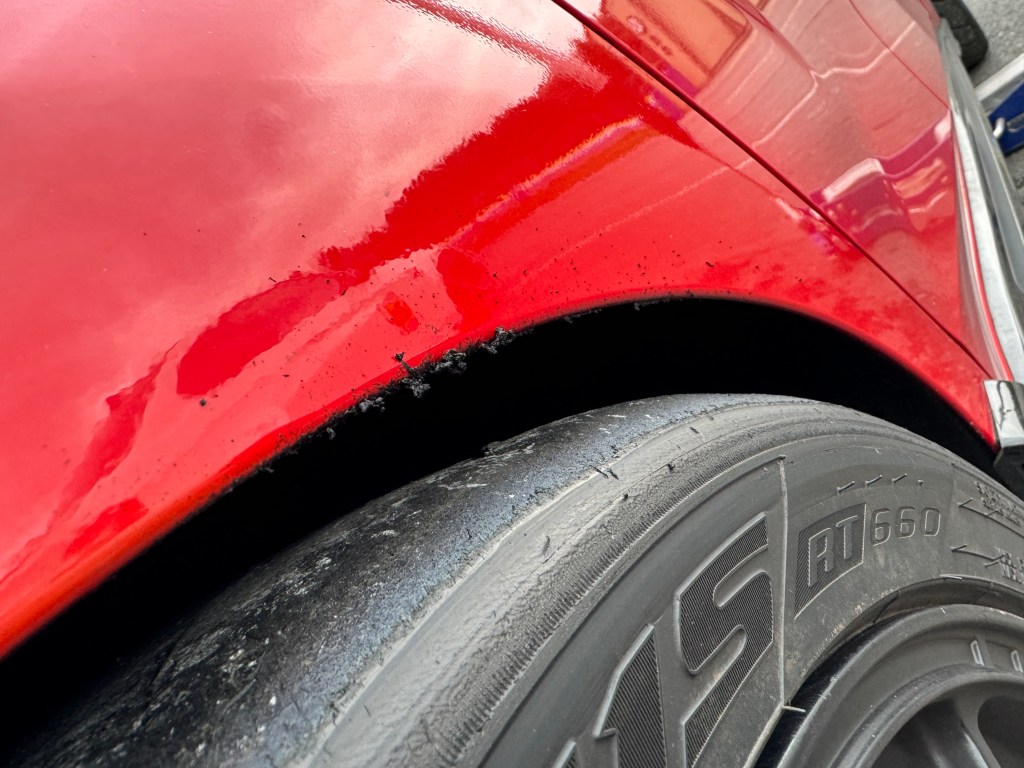 Ergo, VN track drivers typically fit a 235 tire on 18×8.5 +45. My buddy Chris was able to fit a 245 RT660 on a 8.5 +50, but he was at stock ride height. I tried the same tire on a 8.5 + 45 with 1” lowering springs, and it rubbed front and back.